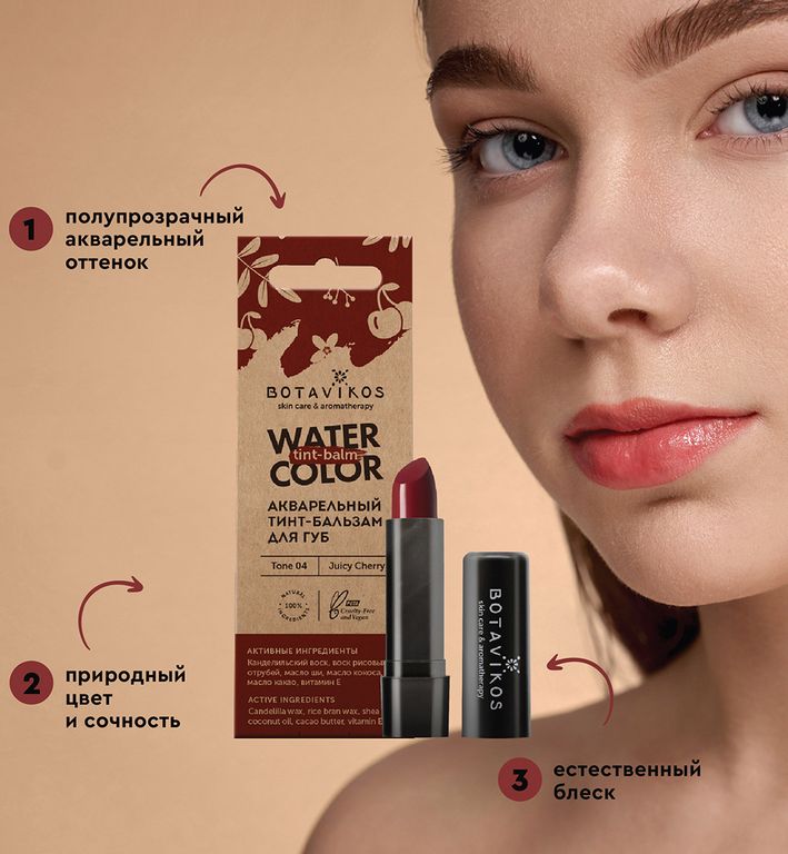 Позаботится о нежной коже в течение всего дня и придаст губам легкий полупрозрачный вишневый оттенок, сочность и очаровательный глянец.